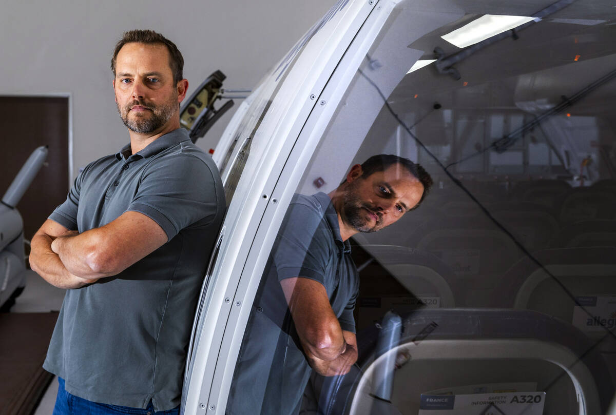 Allegiant Airs neuer Chief Operating Officer Tyler Hollingsworth sitzt am Donnerstag, dem 31. Juli 2025, in einem voll funktionsfähigen Flug-Simulator eines Airbus A320, der zur Ausbildung ihrer Piloten in Las Vegas genutzt wird. (L.E. Baskow/Las Vegas Review-Journal) @Left_Eye_Images